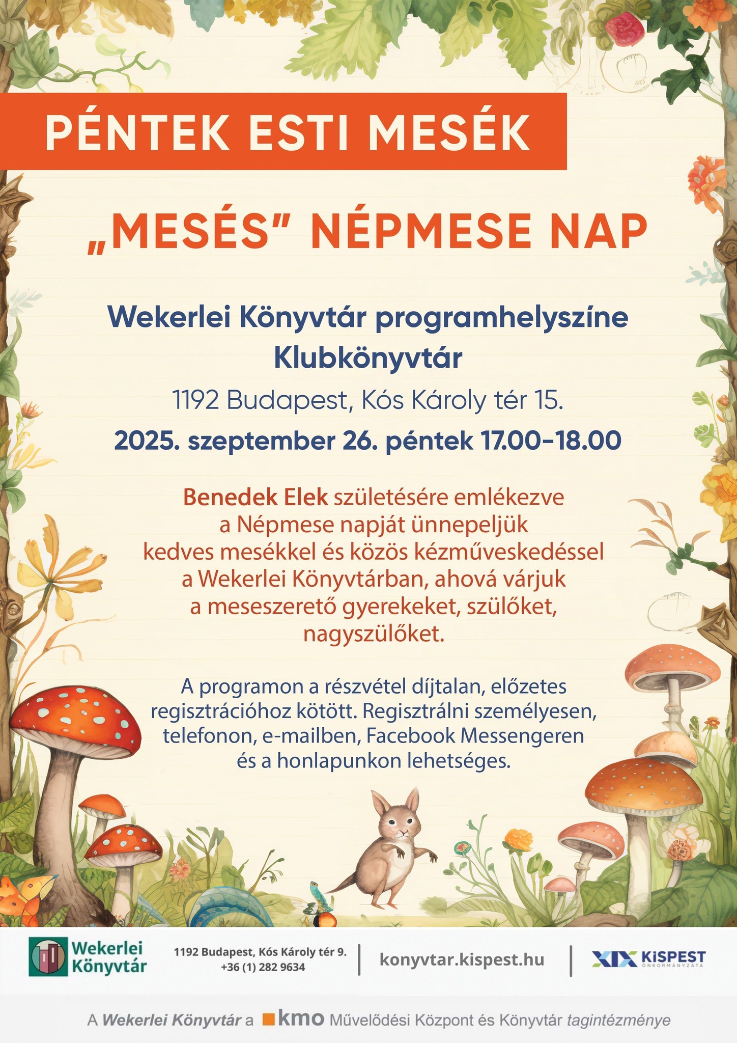 A népmesék világa - MeseKör felnőtteknek; Ősz versszakokban - Versbarátok klubja; Őszköszöntő versek hete; Fotós séta az Orczy-parkban - Wekerlei világjárók; Könyvklub Annával; A népmese napja - Népmesék óvodás és iskolás csoportoknak; „Mesés” népmese nap - Péntek esti mesék; Népmesék hete; Benedek Elek, „a nagy mesemondó”; Őszi Könyves Ajándéknapok - Országos Könyvtári Napok; Díjmentes beiratkozás - Megbocsátás hete - Országos Könyvtári Napok;