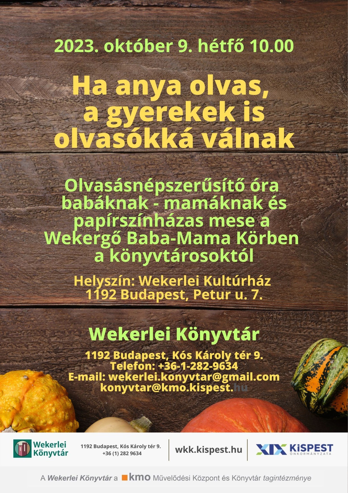 E-mail: konyvtar@kmo.kispest.hu; wekerlei.konyvtar@gmail.com