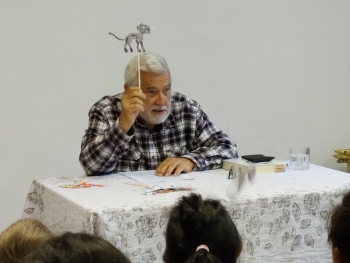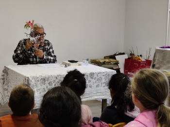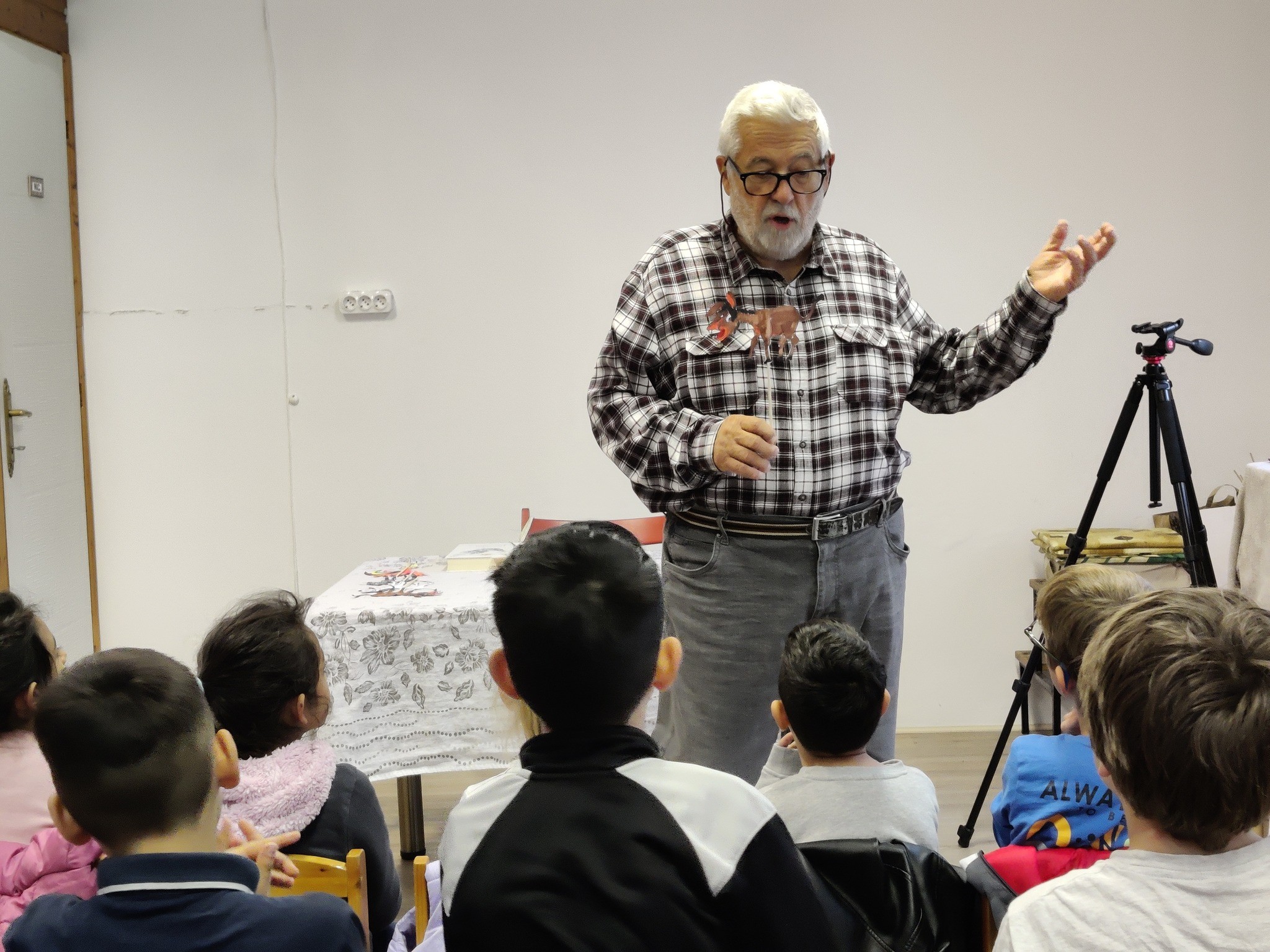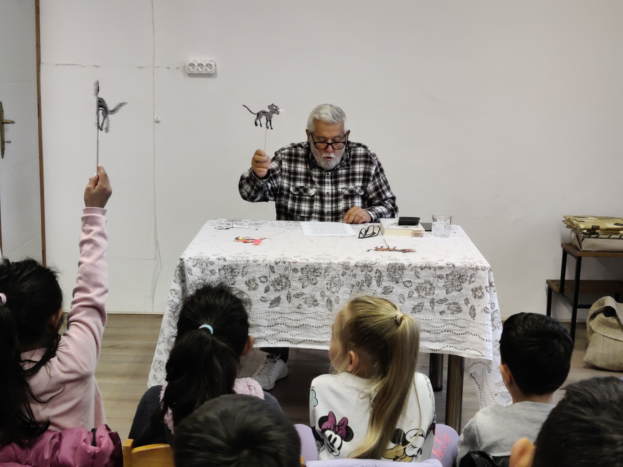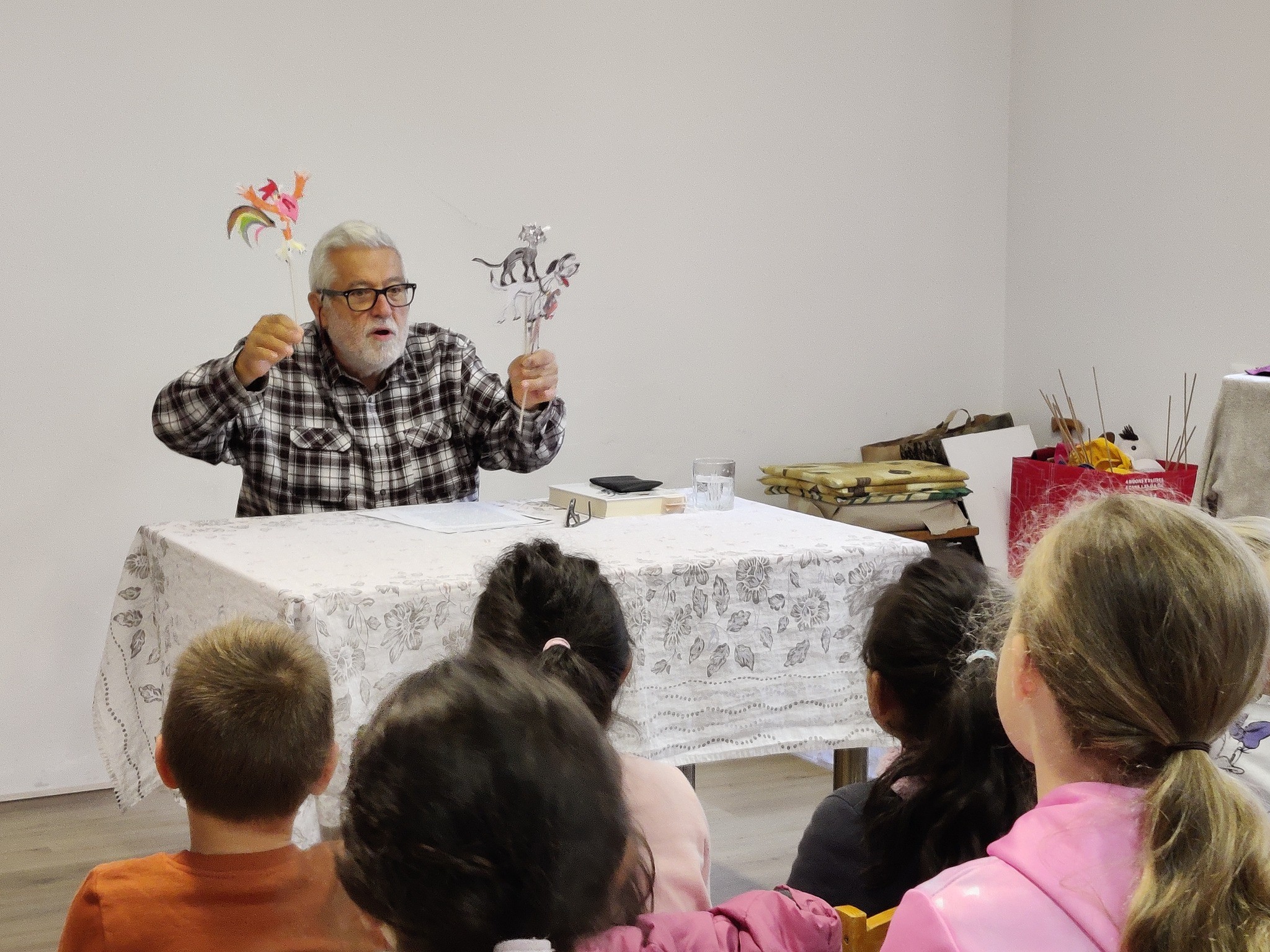 a kutyáról, a macskáról és a kakasról mesélt. A gyerekek is bekapcsolódhattak a mesébe papír