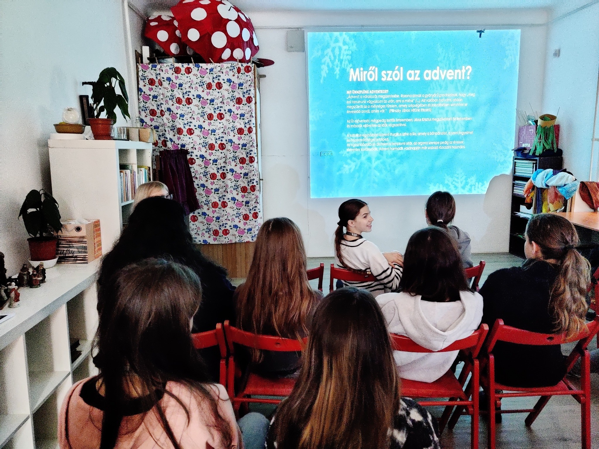 A Kispesti Erkel Ferenc Általános Iskola 7.b osztályos diákjai látogattak el ma délelőtt a Wekerlei Könyvtárba. Együtt készülődtünk az Adventre. Szó volt a karácsonyi ünnepkör jeles napjairól, Szent András, Szent Borbála, Szent Miklós napjáról, az adventi hétvégékről, Luca napjáról, boszorkányüldözésről, Luca székéről, kiskarácsonyról-nagykarácsonyról, vízkeresztről és több más hagyományról, népszokásról.